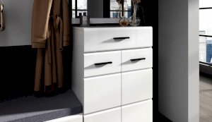 Прихожая Йорк выполнена в современном стиле – сочетает в себе функциональность и эффектный внешний вид: строгая горизонтальная фрезеровка фасадов, контрастные черного цвета ручки и задняя стенка из ХДФ. Глянцевые белые фасады High Gloss из МДФ и зеркала наполняют помещение светом, делают ее ярче и просторнее. Компактная и вместительная, с небольшой глубиной модулей, она поможет правильно организовать систему хранения даже в небольшом помещении.
