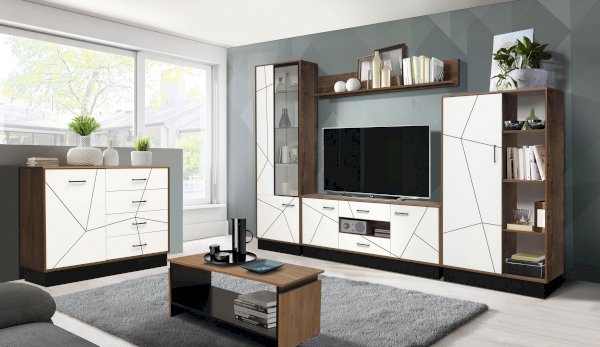 Интрига лежит в основе дизайна данного модуля. При первом взгляде кажется, что сверху находятся три выдвижных ящика и еще один - внизу, в центре. На самом деле выдвижных ящиков два – по центру – сверху и снизу. Ящики снабжены шариковыми направляющими, которые обеспечивают плавный ход выдвижения. Справа и слева расположены два отсека с распашными дверцами, за которыми скрываются по две полки из ЛДСП. Украшение и изюминка модуля – центральная открытая полка. Она как будто улыбается владельцу – открыто, приветливо и дружелюбно.
