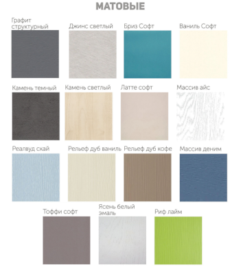 Цвет фасада: Белый глянец, Ваниль глянец, Кофе с молоком глянец, Манго глянец, Мускат глянец, Белый софт, Графит структурный, Джинс светлый, Рельеф дуб ваниль, Рельеф дуб кофе, Реалвуд скай, Кварц Грей софт, Массив деним, Тоффи софт, Ясень белый эмаль, Альберо Браш Серебро, Альберо Ноче, Альберо Эквалипт, Массив айс.