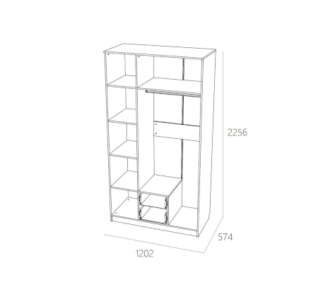 Данный шкаф имеет компактные размеры, но при этом многофункционален. Внутри модуля предусмотрены овальная штанга для одежды на вешалках, в том числе для размещения длинных вещей. Вместительная часть с пятью полками, позволит рассортировать и разместить большое количество вещей.  Два выдвижных ящика внизу идеальны для хранения мелкой одежды. Классические глухие фасады надежно защитят содержимое шкафа от влаги и пыли.