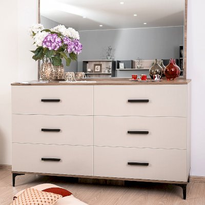 Широкий вместительный комод с шестью ящиками – функциональный модуль, который подходит не только для хранения вещей, но и для размещения телевизора. Столешница и основание комода подчеркнуты контрастным декором Дуб Табачный. Фигурные металлические опоры и ручки из массива органично дополняют модуль.