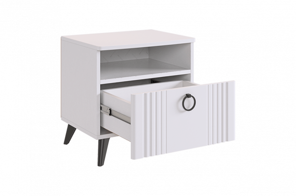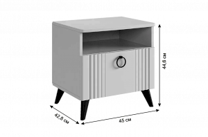 Откройте для себя прикроватную тумбу "Ева" - элегантность и функциональность в одном. Размеры 450х428х446 мм, корпус из ЛДСП белого дерева, фасады из МДФ с матовым покрытием ПВХ. Вертикальные фрезерованные полосы и трендовая металлическая ручка-кнопка добавляют изысканности. Система бесшумного закрывания, один ящик и ниша для хранения обеспечивают комфорт и удобство. Шариковые направляющие и черные пластиковые опоры высотой 120 мм подчеркивают стиль и современность. Прикроватная тумба "Ева" – идеальное сочетание качества, стиля и функциональности для вашей спальни.
