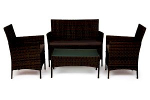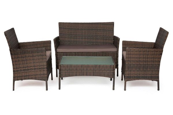 Материал: каркас - металл, спинка и сиденье - полиротанг, столешница - стекло, мягкие элементы - ткань полиэстер с пропиткой от дождя