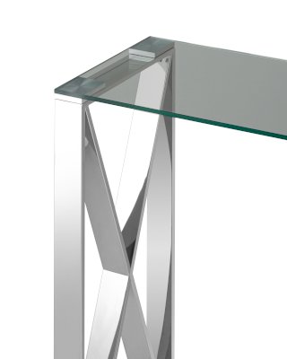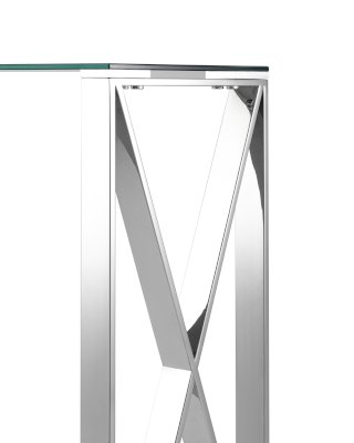 Консоль КРОСС благодаря оригинальной форме станет ярким дизайнерским акцентом в интерьере. Каркас стола изготовлен из нержавеющей стали, столешница - закаленное стекло.