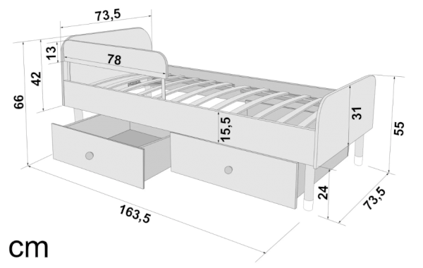 Высота от пола до самого высокого места составляет 66 см. Это позволяет даже маленькому ребенку комфортно забираться и спускаться с нее, не рискуя упасть. Специальная конструкция кровати позволяет с лёгкостью присесть или прилечь рядом взрослому, если ребенок не может заснуть.