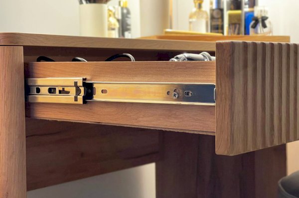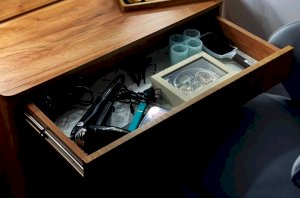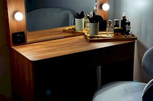 Трюмо Адам — это идеальное сочетание стиля и практичности. С широким фацетированным зеркалом, в котором встроена подсветка из 6 лампочек, оно создает атмосферу профессиональных студий визажистов прямо у вас дома. Комфорт и функциональность обеспечиваются дополнительными элементами, такими как выключатель, розетка для фена и выдвижной ящик для хранения украшений и косметики. Элегантные закругленные углы завершают дизайн, делая его идеальным дополнением к вашей спальне.
