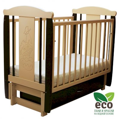 Кроватка "Соня 05" имеет механизм качания продольный маятник. Механизм качания фиксируется. Возможен вариант кровати с ящиком.