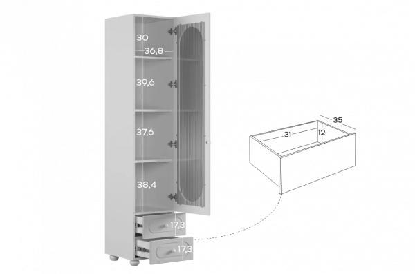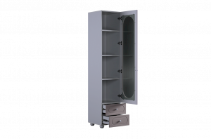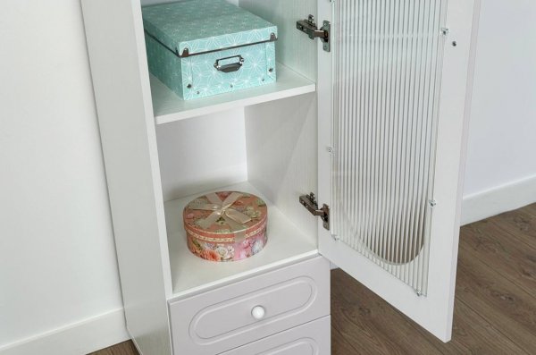 Модель оснащена одной распашной дверцей с вставкой из прозрачного рифлёного стекла, а также двумя вместительными выкатными ящиками в нижней части для хранения одежды, текстиля или аксессуаров. Внутреннее наполнение можно выбрать в зависимости от задач: шкаф комплектуется полками или штангой для плечиков, что позволяет адаптировать его под разные потребности.