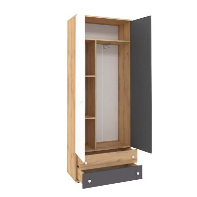 Наполнение 92 Шкафа для одежды и белья продумано до мелочей: выдвижные ящики, стеллаж для одежды и выдвижная штанга для плечиков – всё это помещается в одном модуле. Три варианта фасадов позволяет выбирать цветовое решение для дверок шкафа: заказывать их в контрастном исполнении или в монохромном. Для выбора доступны фасады Белый и Графит. Для надежности рекомендуем крепить шкаф к стене на подвесы.