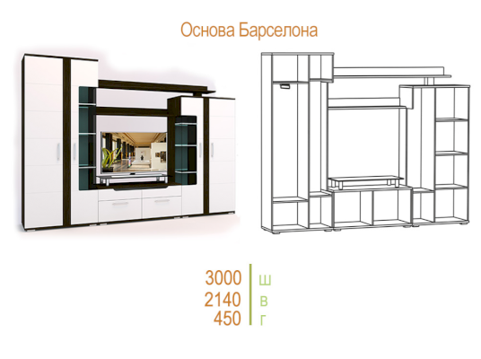 Стенка «Барселона» выполнена в стильном современном дизайне, прекрасно сочетающем в себе контрастность цвета, ассиметричное исполнение, стеклянные витринные модули и элементы подсветки. Фасады МДФ