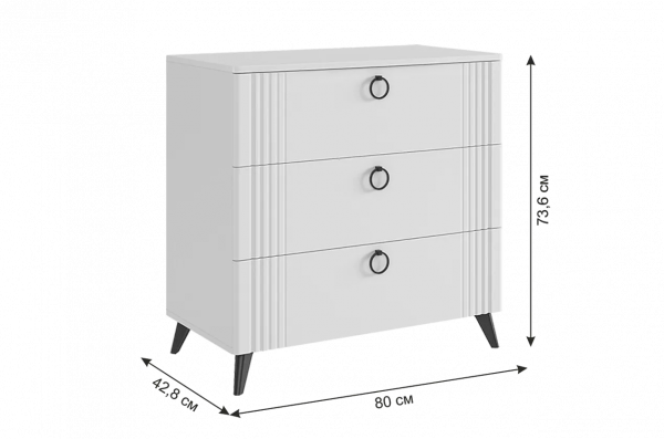 Комод "Ева" идеально сочетает в себе стиль и функциональность. С его размерами 800х428х736 мм он будет отличным дополнением к любому интерьеру. Корпус комода выполнен из ЛДСП в белом деревянном цвете, а фасады - из МДФ, облицованного пленкой ПВХ белого матового цвета. Смело можно сказать, что комод выглядит элегантно. Он оснащен тремя просторными ящиками на шариковых направляющих, что обеспечивает плавное и бесшумное скольжение. Удобные ручки-кнопки добавляют комоду элегантности и обеспечивают удобство использования. Также комод имеет бесшумную систему закрытия фасадов, что делает его идеальным выбором для спален или детских комнат. Пластиковые черные опоры высотой 120 мм придают комоду устойчивость и добавляют удобство уборки. Комод "Ева" - это не просто место для хранения, это изысканный акцент в интерьере вашего дома, который радует своей красотой и функциональностью на протяжении многих лет. Он создает атмосферу уюта и комфорта, идеально сочетаясь с любыми элементами интерьера и придавая вашему дому неповторимый шарм и элегантность.