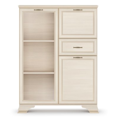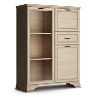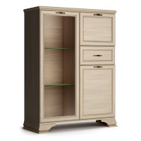 Стеклодверь дает возможность любоваться красотой наполнения шкафа, а система ящиков и отделений с дверками поможет хранить в закрытом любые предметы.