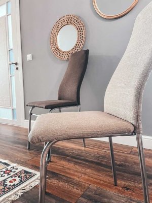 Сидение и спинка стула мягкие, обитые мебельной тканью. Универсален, удобен в использовании. Эргономичная спинка поддерживает не только поясницу, но и лопатки, тем самым сохраняет осанку. Изделие установлено на устойчивых металлических ножках с пластиковыми заглушками.