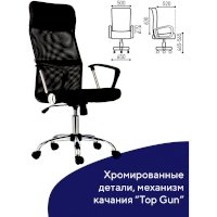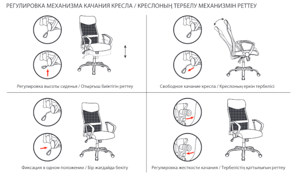 Кресло оснащено механизмом качания «топ-ган» с регулировкой под вес пользователя и возможностью фиксации спинки в рабочем положении.