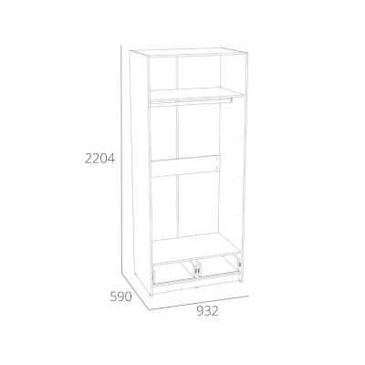 Шкаф оснащен двумя выдвижными ящиками для вещей, которые плавно и бесшумно скользят за счет шариковых направляющих, а также овальной штангой для хранения одежды на вешалках. Шкаф можно дополнить другими модульными шкафами из одноименной коллекции.