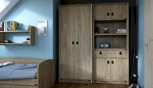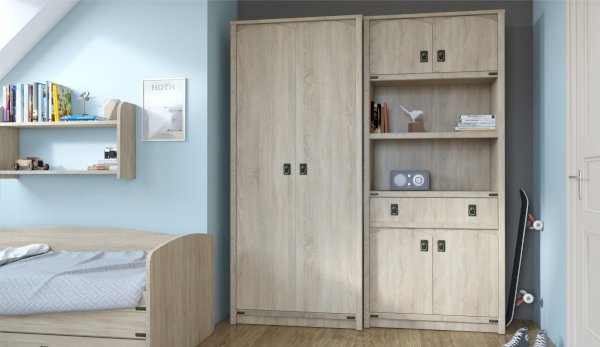 Шкаф - универсальное решение для хранения вещей. Две открытые полки подходят для книг и учебников, декоративных предметов. Декоративные накладки и профиль из МДФ по вертикальным краям закрывают острые края корпуса и придают шкафу более эффектный и надежной вид. Стилизованные металлические ручки MARINE бронзового цвета и декоративные элементы в тон – это изюминка шкафа Валенсия. Идеально компонуется со всеми модулями системы Валенсия.