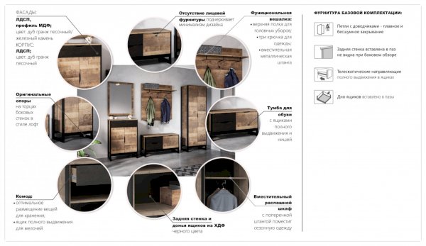 Стильная и лаконичная прихожая Стокгольм выполнена в стиле лофт. Особенность дизайна – это сочетание реалистичных по цвету и тактильности трендовых декоров, которые соответствуют последним городским тенденциям. «Дуб Гранж» привлекает песочным оттенком и имитацией вручную обработанного дерева с выразительной зернистой текстурой, характерной формой досок. Стильный серый цвет «Железного камня» с металлическими разводами и новая текстура состаренной штукатурки в сочетании с гладкостью металла вносят индустриальныи? колорит. Оригинальные ножки-опоры из контрастного профиля МДФ, расположенные по бокам модулей, имитируют металл и подчеркивают стиль коллекции. Прихожая функциональна: вешалка имеет дополнительные крючки, выдвижной ящик комода удобен для хранения мелочей и документов, а шкаф с поперечной штангой порадует своей вместимостью. Обувная тумба разместит в себе домашнюю и сезонную обувь.