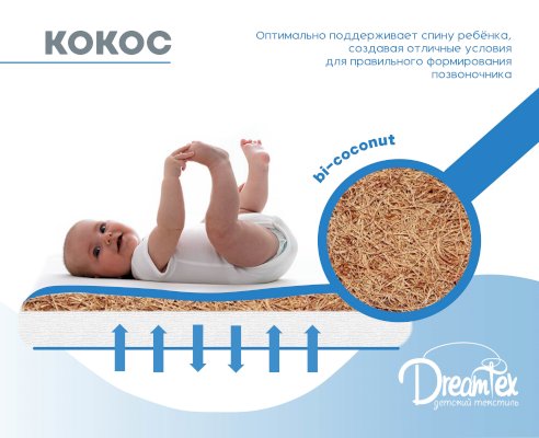 • Кокосовая койра – идеальный, по мнению педиатров и ортопедов, наполнитель для детских матрасов и рекомендован для детей от 0 до 12 месяцев. Данный наполнитель не вызывает аллергии, а его жесткость оптимальна для формирования позвоночника. Высокая пористость кокосовой койры гарантирует отличную вентиляцию вне зависимости от количества слоев. Кокос не впитывает запахи и влагу, что немаловажно в детском изделии.