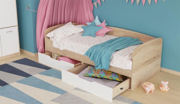 Топчан в скандинавском стиле со скругленным изголовьем и высокой спинкой имеет два больших ящика, с помощью множества роликов его легко выдвинуть. Для безопасности и удобства открывания выдвижной ящик вместо ручек оснащен выемками на лицевой части фасада. Высокая спинка в топчане предохраняет от соприкосновения с холодной стеной во время сна. Пользоваться кроватью может взрослый и ребенок любого возраста, так как она имеет размеры стандартной кровати 90х200см, устойчивую конструкцию и нейтральный для интерьера цвет. Идеально компонуется со всеми модулями системы Стелс. Мебель выполнена из высококачественных экологичных материалов.