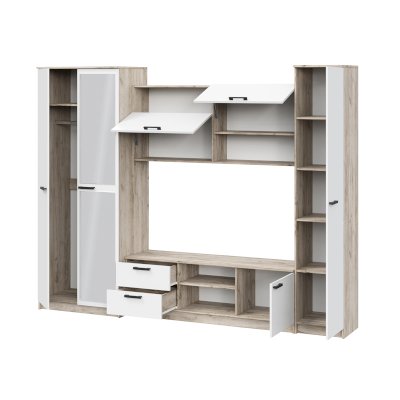 • Гостиная состоит из трёх модулей (шкаф платяной, шкаф бельевой, средняя секция), которые при желании можно устанавливать отдельно друг от друга, размещая в разных комнатах