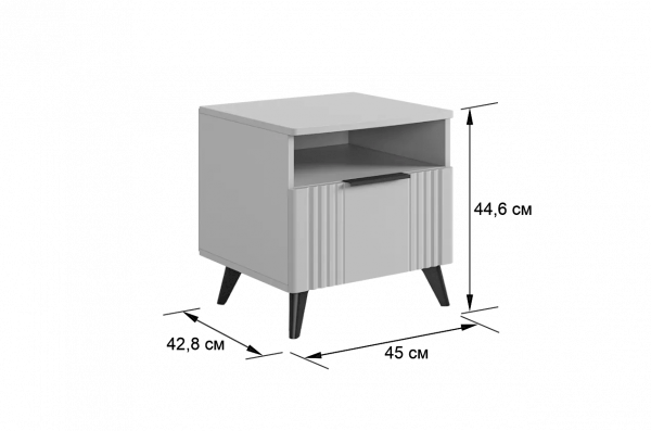 Тумба оснащена стильной ручкой и имеет удобное наполнение: выкатной ящик на шариковых направляющих и открытая ниша для хранения вещей. Это позволяет рационально использовать пространство и разместить различные предметы.