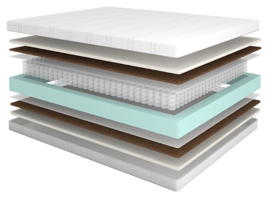 Наполнитель: Высокоэластичная пена ElasticFoam, кокосовая койра, НПБ 256 шт/кв.м., система усиления боковой поддержки, ППУ