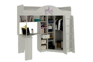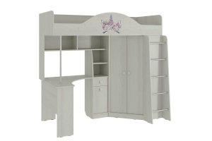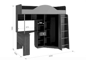 Состоит из: шкафа для одежды, стола, выдвижного ящика, шкафа с полкой, спального места, полок.