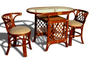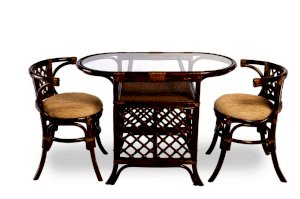 Комплект из ротанга: два кресла и узкий кофейный столик.