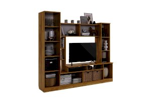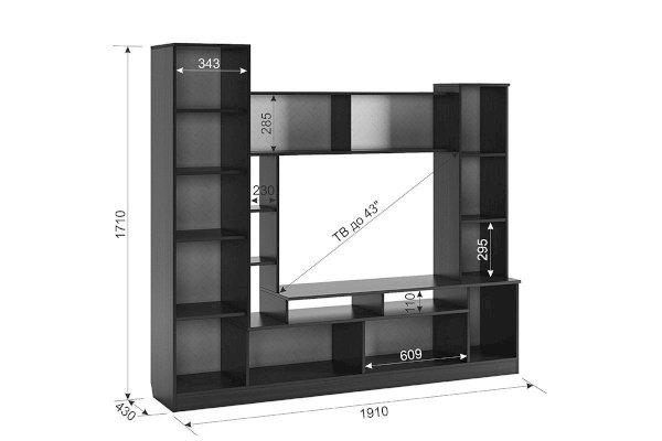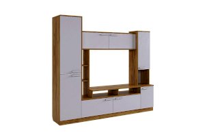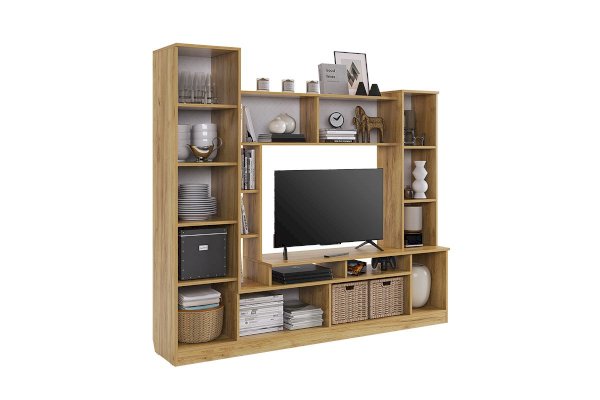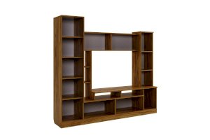 Состоит из: открытых полок, закрытых полок, ниши под телевизор