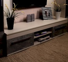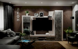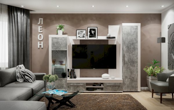 Брутальная эстетика. Законодатели интерьерных тенденций “сдали” бетону кухню, ванную, облицовку стен и пола, а теперь уже и мебель для других комнат. Особенно гармонично материалы “под бетон” выглядят в лофтах - популярных однокомнатных планировках недорогих квартир, ориентированных на молодую аудиторию. Спокойный и мужественный “бетонный” декор Ателье Светлый на фасадах стенки ЛЕОН облечен в раму из древесного декора Ясень Анкор светлый.
