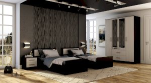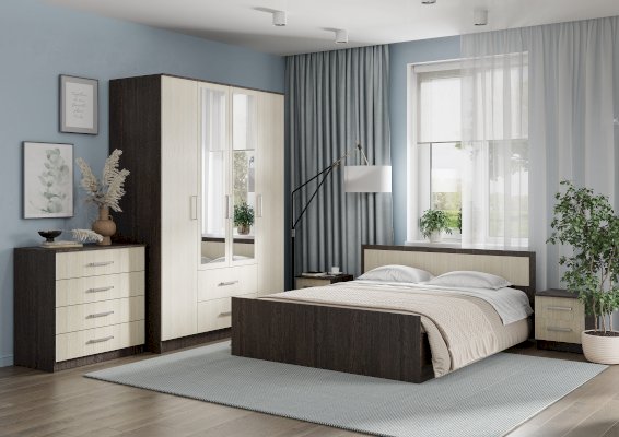 Вместительный четырёхстворчатый шкаф Фиеста справится с большим гардеробом и другими вещами. Модель выполнена из качественной ЛДСП. Корпус сделан в темном цвете венге, а фасады – в светлом лоредо. Комплектация представляет собой центральную зону с двумя нижними выкатными ящиками и отделения со штангой для одежды на плечиках. Справа и слева расположились многочисленные полки для вещей. В створки центральных дверок вмонтированы зеркала.