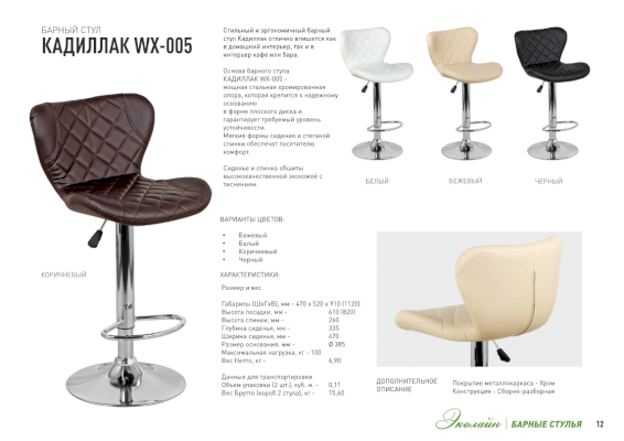 Популярный барный стул КАДИЛЛАК WX-005 со спинкой непременно придется вам по вкусу и создаст в кафе неповторимую атмосферу. Основа барного стула КАДИЛЛАК WX-005 - мощная стальная хромированная опора, которая крепится к надежному основанию в форме плоского диска и гарантирует требуемый уровень устойчивости. Мягкие формы сидения и стеганой спинки обеспечат посетителю комфорт.