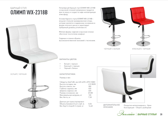 Популярный барный стул ОЛИМП WX-2318B со высокой спинкой непременно придется вам по вкусу и создаст в кафе неповторимую атмосферу. Основа барного стула ОЛИМП WX-2318B - мощная стальная хромированная опора, которая крепится к надежному основанию в форме плоского диска и гарантирует требуемый уровень устойчивости. Мягкие формы сидения и высокая спинки обеспечат посетителю комфорт.